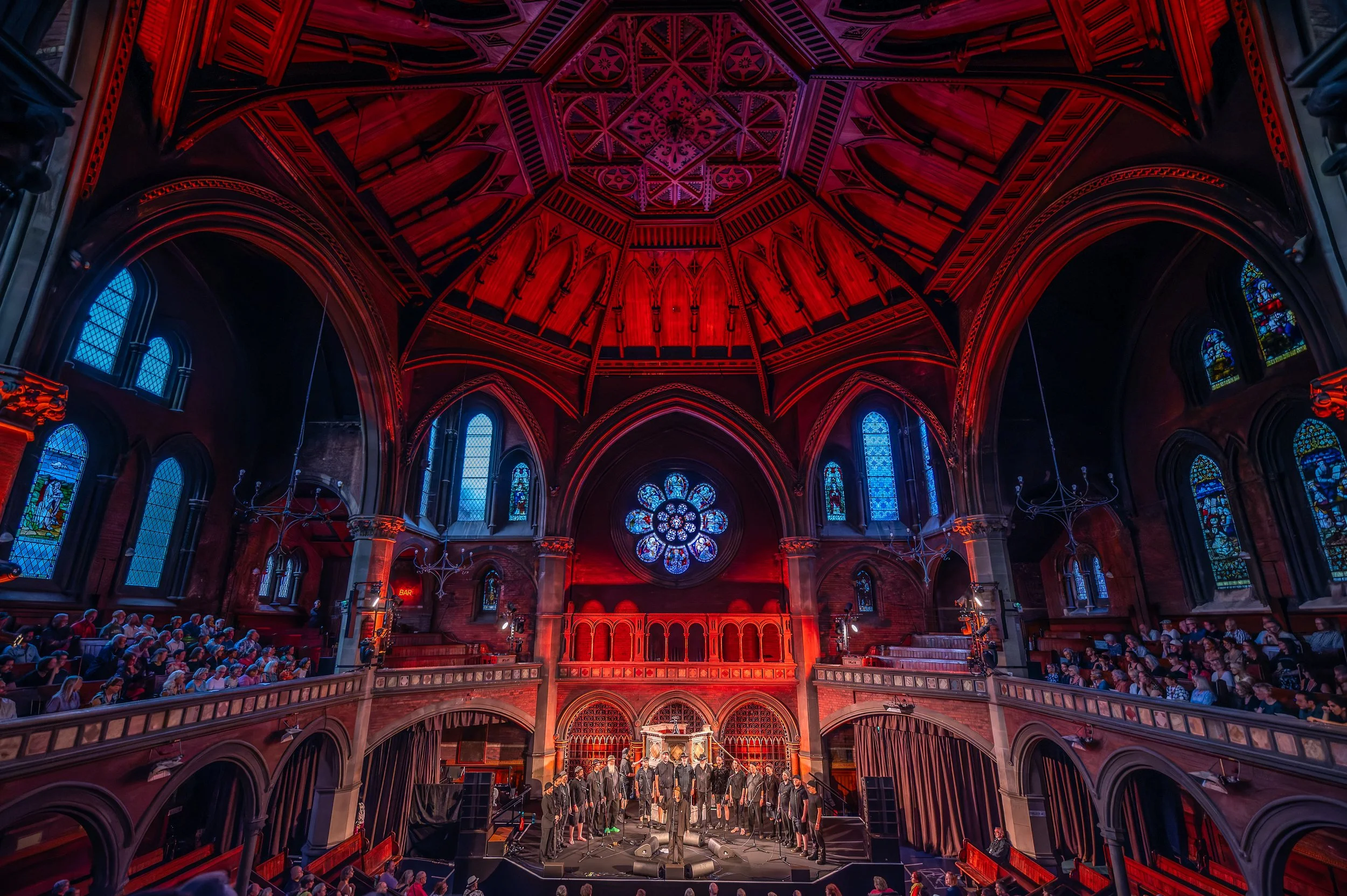 Inside a Gothic-style church or cathedral with stained glass windows and a large rose window in the center. The ceiling is illuminated with red lighting. A choir or vocal group is performing at the altar, with people seated on the balconies and in th View fullsize
