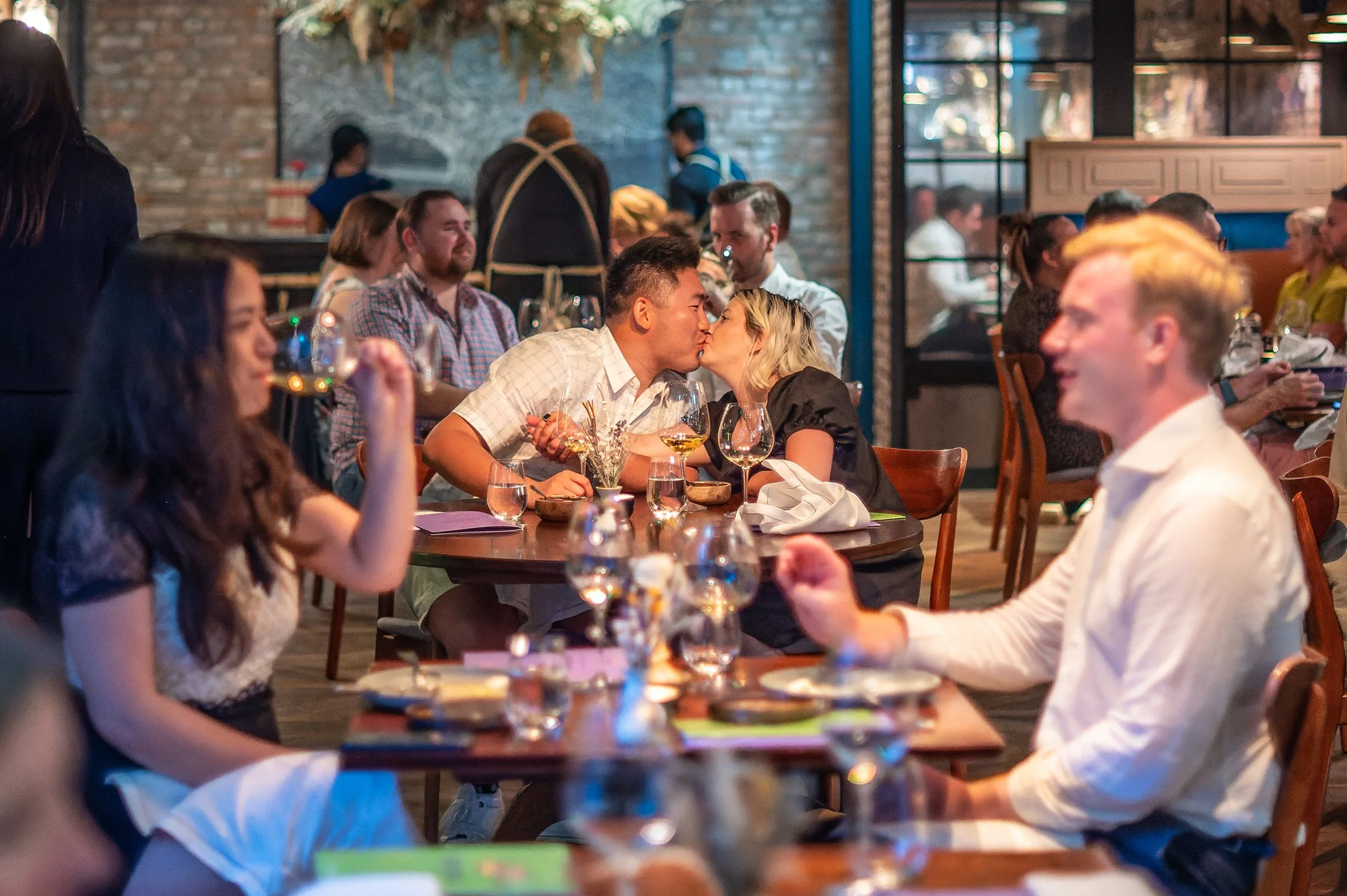 People enjoying a meal and conversing in a modern restaurant with large windows, warm lighting, and wooden decor.